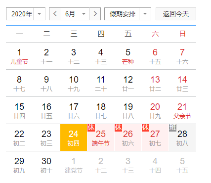 2020年6月25日(周四)至2020年6月27日(周六)放假調休,共3天。6月28號(星期日)正式上班。
