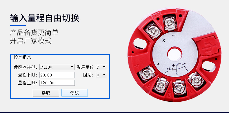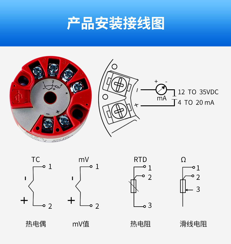 溫度變送器采用熱電偶、熱電阻作為測溫元件,從測溫元件輸出信號送到變送器模塊,經(jīng)過穩(wěn)壓濾波、運(yùn)算放大、非線性校正、V/I轉(zhuǎn)換、恒流及反向保護(hù)等電路處理后,轉(zhuǎn)換成與溫度成線性關(guān)系的4~20mA電流信號0-5V/0-10V電壓信號,RS485數(shù)字信號輸出。